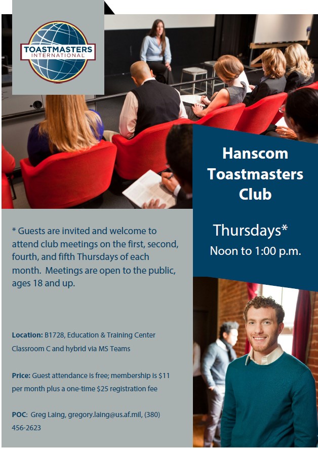 Improve your public speaking, communication, evaluation and leadership skills with Toastmasters. The Hanscom Toastmasters club meets at the Hanscom Education & Training Center, and via Teams, on the first, second, fourth and fifth Thursdays of each month from noon to 1 p.m. Everyone ages 18 and up is invited to attend