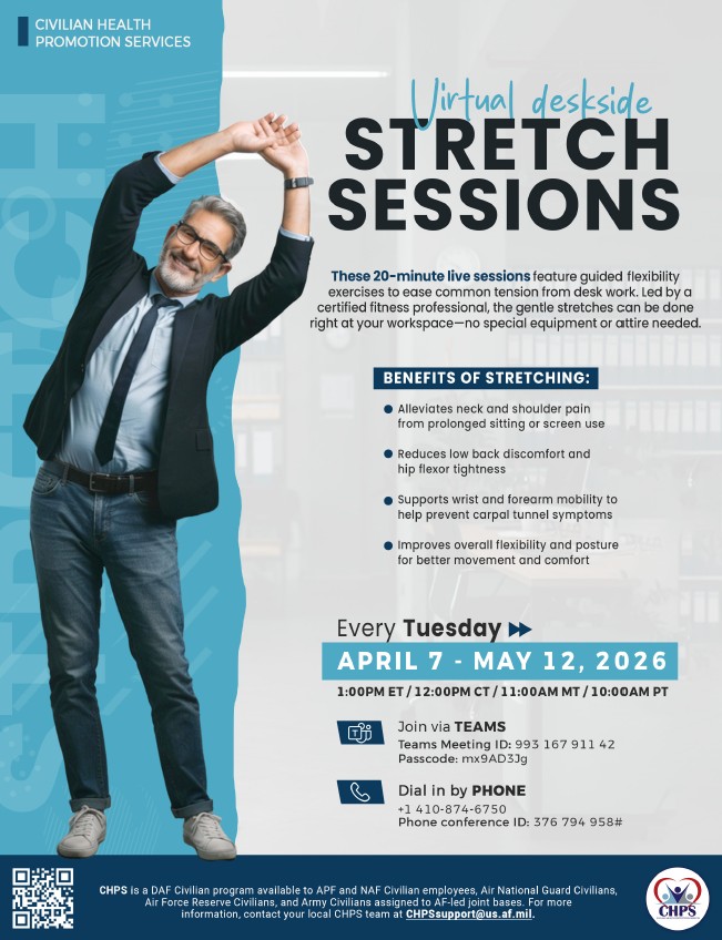 Air Force Civilian Health Promotion Services officials are offering virtual "deskside stretch" sessions to promote workplace wellness and reduce common musculoskeletal issues.
