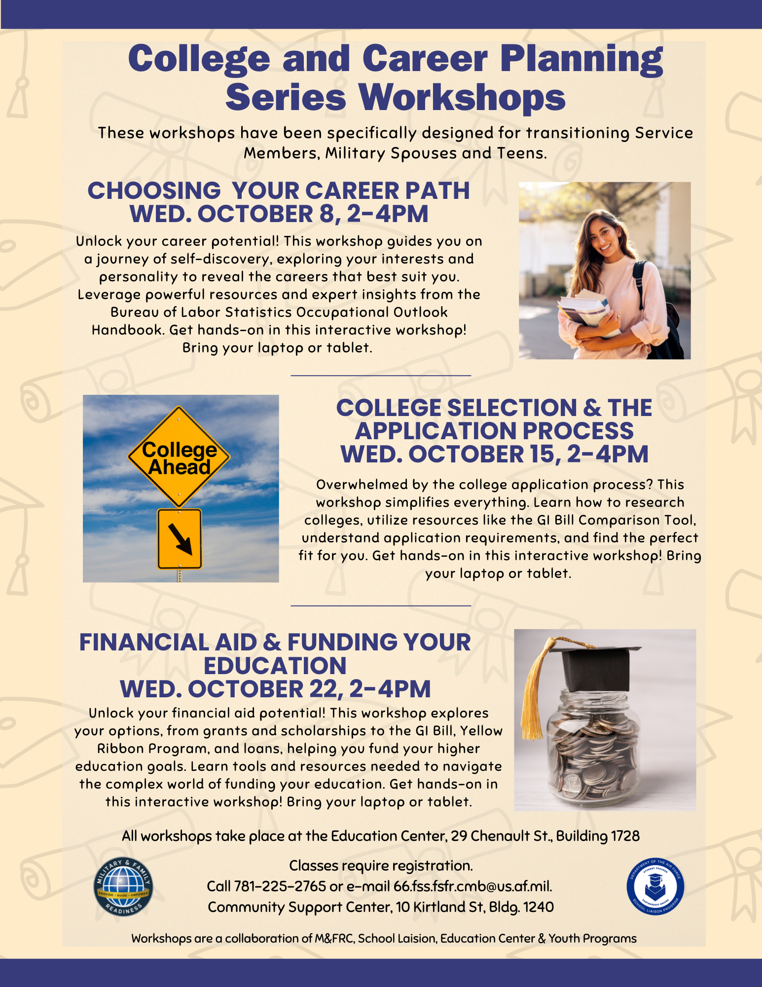 The Hanscom Education Center will host the second session of the College and Career Planning Series Oct. 15 from 2 to 4 p.m. at building 1728. The workshop, College Selection and the Application Process, will guide participants through researching schools, understanding application requirements, and utilizing resources such as the GI Bill Comparison Tool. The session is open to transitioning service members, military spouses, and teens. Attendees should bring a laptop or tablet.