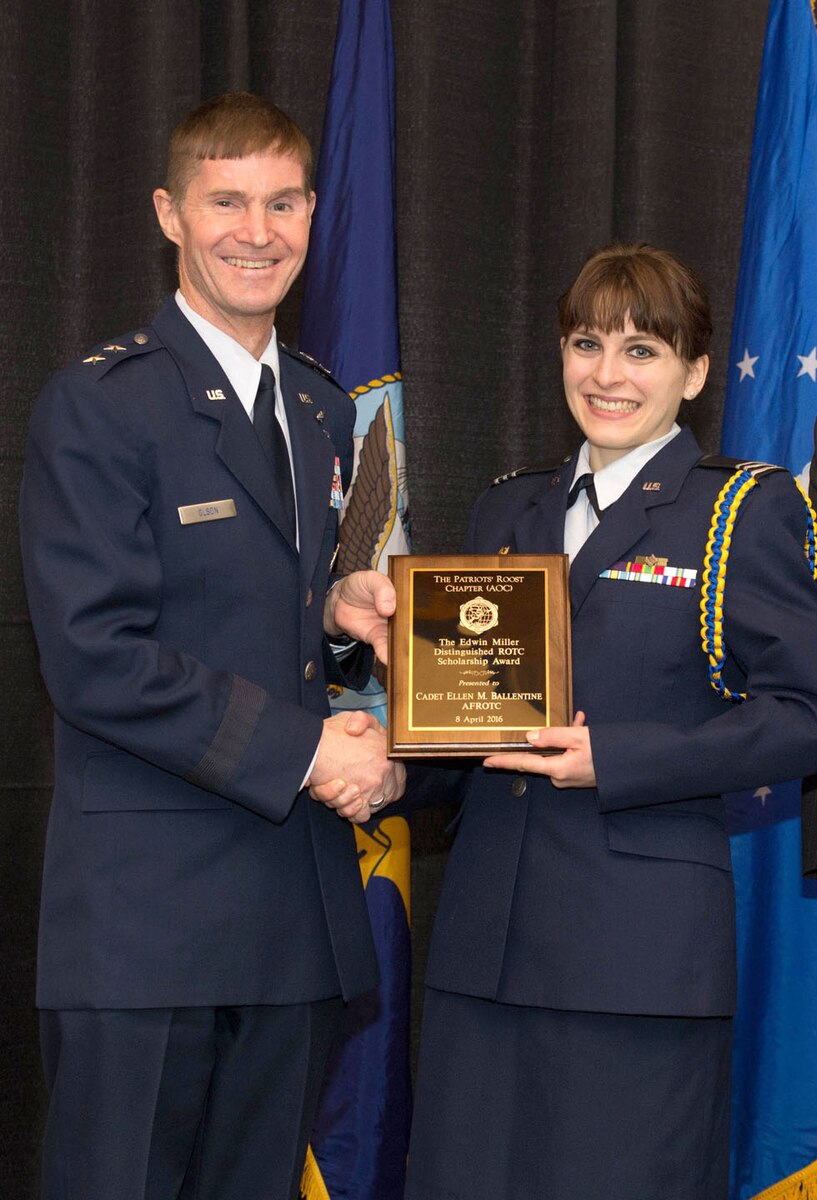 Maj. Gen. Craig S. Olson, Command, Control, Communications, Intelligence and Networks program executive officer, presents the Edwin Miller Distinguished ROTC Scholarship Award to AFROTC Cadet Ellen Ballentine in Bedford, Mass., April 8. Olson is preparing to retire following 34 years of service and recommends those starting out in their career love what they're doing and remember that the best job is the one they are in. (U.S. Air Force photo by Jerry Saslav)